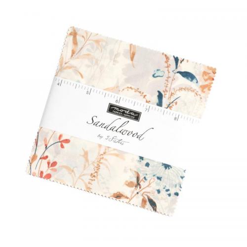 Charm packs are 5"-square blocks of assorted fabrics which come exclusively from one manufactured line. The number of blocks included in the pack varies depending on the number of bolts in the fabric line. On average there are 35 to 40 per pack, but the number can vary from 25-50. All fabrics are 100% cotton.