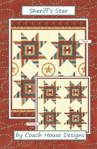 This pattern includes in instructions for a 76 x 80 star lap quilt without applique and a 76 x 96 star twin quilt with applique. Cowboy themed and uses a jelly roll or 2 1/2 strip roll.