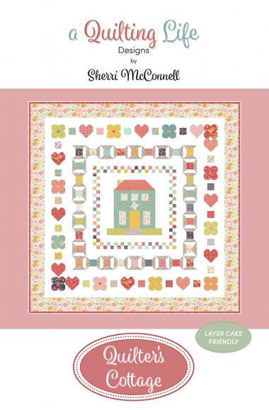 Immerse yourself in the charm of the countryside with this delightful quilt pattern, perfect for both home decor and personal projects. The quilt features a whimsical cottage at its center, surrounded by a vibrant border of hearts, spools of thread, scissors, and flowers, all set against a soft pink background. The design, by Sherri McConnell, is crafted to bring a touch of quilter's magic into any space, making it ideal for quilters looking to add a personal touch to their creations or for businesses aiming to offer unique, handcrafted items. The quilt measures 60 x 60, suitable for layer cake friendly projects, ensuring ease and enjoyment in the quilting process.